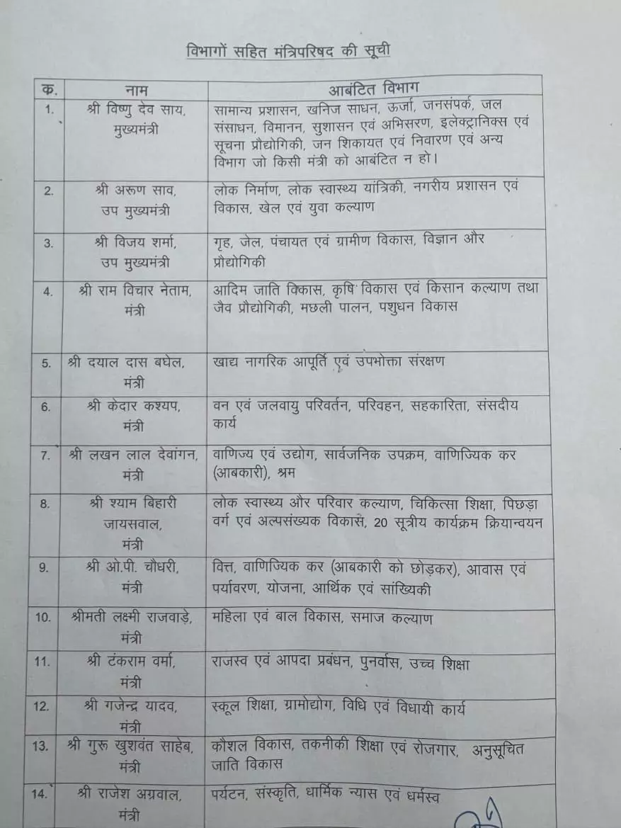 रायपुर। मंत्रियों के बीच विभागों का बंटवारा कर दिया गया है। सीएम साय ने कहा,सुस्पष्ट कार्य विभाजन एवं दायित्व के साथ मेरे कैबिनेट के सहयोगीगण नई ऊर्जा के साथ छत्तीसगढ़ महतारी की सेवा करने तैयार हैं। सभी मंत्रीगण प्रदेश की आकांक्षाओं को मूर्त रूप देने, हमारे संकल्पों की सिद्धि कर प्रधानमंत्री नरेन्द्र मोदी के विकसित भारत के सपने को साकार करने, विकसित छत्तीसगढ़ बनाने में अपना योगदान देने समूची प्रतिबद्धता के साथ तैयार हैं।