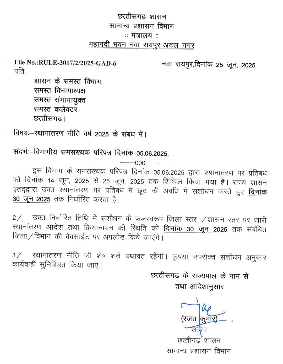 रायपुर।स्थानांतरण नीति 2025 के तहत अब राज्य के कर्मियों को राहत मिली हैं पूर्व मे स्थानांतरण पर प्रतिबंध को 14 से 25 जून तक रखा गया था। जिसे बढ़ा कर अब 30जून कर दिया गया हैं शेष निर्णय यथावत रहेंगे।