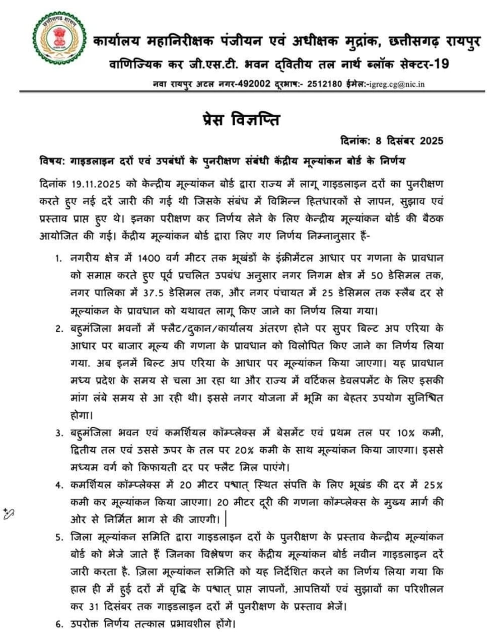 रायपुर। छत्तीसगढ़ में जमीन की नई गाइडलाइन दरों को लेकर हो रही आपत्तियों के बीच मुख्यमंत्री विष्णुदेव साय ने रविवार को कहा था कि जरूरत पड़ने पर सरकार इसमें पुनर्विचार करने के लिए तैयार है। वहीं अब सरकार ने बड़ा यू-टर्न लेते हुए केंद्रीय मूल्यांकन बोर्ड की बैठक में कई महत्वपूर्ण निर्णय लिए हैं। बैठक में हाल ही में जारी की गई बढ़ोतरी से जुड़े कई प्रावधानों को वापस ले लिया गया है। साथ ही पूरे प्रदेश में मूल्यांकन की एक एकरूप व्यवस्था लागू कर दी गई है।