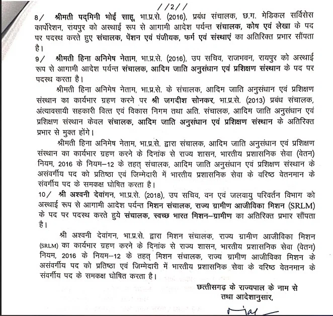 आईएएस पद्मिनी भोई साहू, प्रबंध संचालक छग मेडिकल सर्विसेस कार्पोरेशन रायपुर को अस्थाई रूप से आगामी आदेश पर्यन्त संचालक कोष एवं लेखा के पद पर पदस्थ करते हुए संचालक पेंशन एवं पंजीयक, फर्म एवं संस्थाएं का अतिरिक्त प्रभार सौंपा गया. आईएएस हिना अनिमेष नेताम, उप सचिव राजभवन रायपुर को अस्थाई रूप से आगामी आदेश पर्यन्त संचालक आदिम जाति अनुसंधान एवं प्रशिक्षण संस्थान के पद पर पदस्थ किया गया है. हिना अनिमेष नेताम के संचालक आदिम जाति अनुसंधान एवं प्रशिक्षण संस्थान का कार्यभार ग्रहण करने पर आईएएस जगदीश सोनकर प्रबंध संचालक अंत्यावसायी सहकारी वित्त एवं विकास निगम तथा अति. संचालक, आदिम जाति अनुसंधान एवं प्रशिक्षण संस्थान केवल संचालक, आदिम जाति अनुसंधान एवं प्रशिक्षण संस्थान के अतिरिक्त प्रभार से मुक्त होंगे.