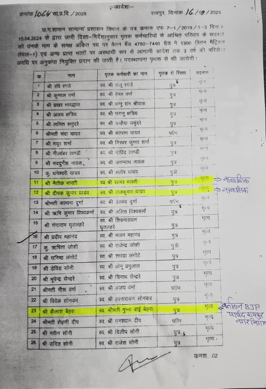 रायपुर। छत्तीसगढ़ के मुख्यमंत्री विष्णु देव साय के सामान्य प्रशासन एवं नगरीय निकाय विभाग ने अनोखा कारनामा कर दिखाया है। रायपुर नगर निगम के भाजपा पार्षद को अनुकंपा नियुक्ति के रूप में भृत्य के पद पर नियुक्ति दे दी गयी है। यह नियुक्ति उनके मां की मृत्यु के बाद दी गयी है।