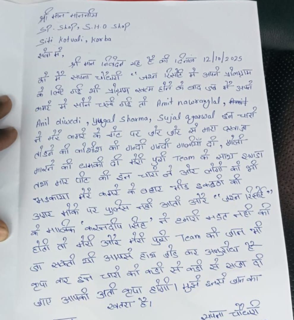 बता दें कि छत्तीसगढ़ के कोरबा में 12 अक्टूबर को जश्न रिजॉर्ट में हरियाणा की मशहूर डांसर सपना चौधरी के साथ दुर्व्यवहार और गोली मारने की धमकी देने का मामला सामने आया था। यहां सपना चौधरी का कार्यक्रम आयोजित था, कार्यक्रम के दौरान भारी भीड़ और हंगामे के कारण उन्होंने ढाई घंटे की जगह सिर्फ एक घंटे में ही कार्यक्रम को खत्म कर दिया।