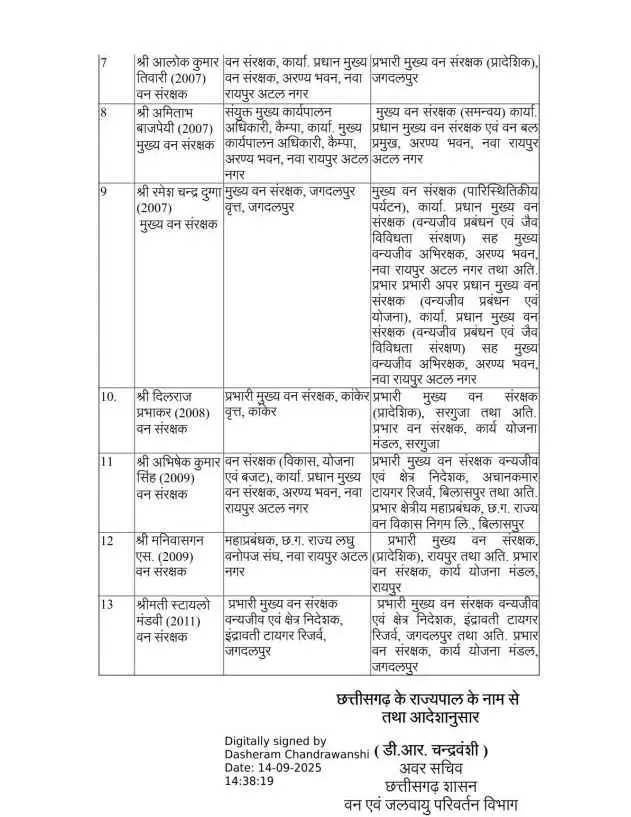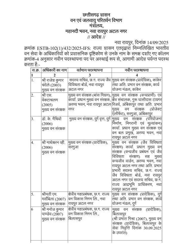 रायपुर। छत्तीसगढ़ शासन ने भारतीय वन सेवा (IFS) अधिकारियों के प्रभार में बदलाव के साथ-साथ नवीन पदस्थापना की गई है. दो अलग-अलग तारीखों में जारी आदेश में कुल मिलाकर 15 आईएफएस अधिकारी प्रभावित हुए हैं. वन एवं जलवायु परिवर्तन विभाग की ओर से 7 अक्टूबर को जारी आदेश के अनुसार, आईएफएफ प्रेम कुमार को छत्तीसगढ़ राज्य वन विकास लिमिटेड का प्रबंध संचालक बनाया गया है. वहीं आईएफएस संजीता गुप्ता को छत्तीसगढ़ राज्य लघु वन उपज संघ का कार्यकारी संचालक नियुक्त किया गया है.