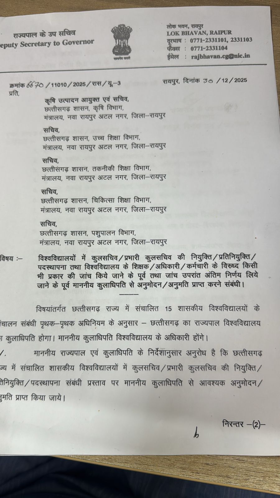रायपुर। शासकीय विश्वविद्यालयों में अब किसी भी अधिकारी, शिक्षक या कर्मचारी के खिलाफ जांच शुरू करने से पहले राज्यपाल की अनुमति अनिवार्य हो गई है। जांच पूरी होने के बाद अंतिम निर्णय लेने के लिए भी कुलाधिपति की स्वीकृति जरूरी होगी। इस संबंध में लोकभवन से आदेश जारी कर दिए गए हैं। बता दें कि इस आदेश के बाद छत्तीसगढ़ में राज्यपाल और राज्य सरकार के बीच अधिकारों को लेकर टकराव की स्थिती पैदा हो गई है।