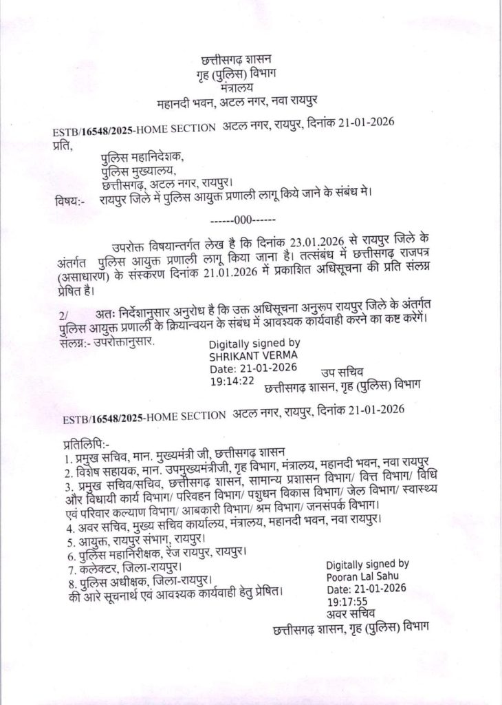 रायपुर। छत्तीसगढ़ शासन ने आज से राजधानी रायपुर में पुलिस कमिश्नरी प्रणाली लागू करने संबंधी अधिसूचना जारी कर दी है। गृह (पुलिस) विभाग द्वारा जारी अधिसूचना के अनुसार रायपुर नगर क्षेत्र को औपचारिक रूप से पुलिस कमिश्नरेट घोषित किया गया है। यह व्यवस्था 23 जनवरी 2026 से प्रभावशील होगी।