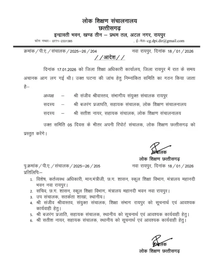 रायपुर डीईओ कार्यालय अग्निकांड: बनाई गई तीन सदस्यीय जांच समिति, 5 दिन में रिपोर्ट देगी टीम