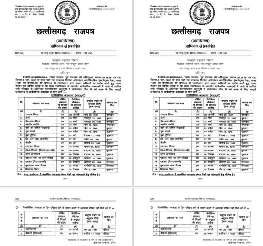 रायपुर। सरकारी अमले के लिए नया साल भरमार छुट्टियों के साथ आ रहा है। राज्य शासन ने इन छुट्टियों को राजपत्र में प्रकाशित कर दिया है। हालांकि कुछ छुट्टियां रविवार को पद रही है, जिसकी वजह से शिक्षकों और कर्मचारियों को उस छुट्टी का अतिरिक्त लाभ नहीं मिल पाएगा।