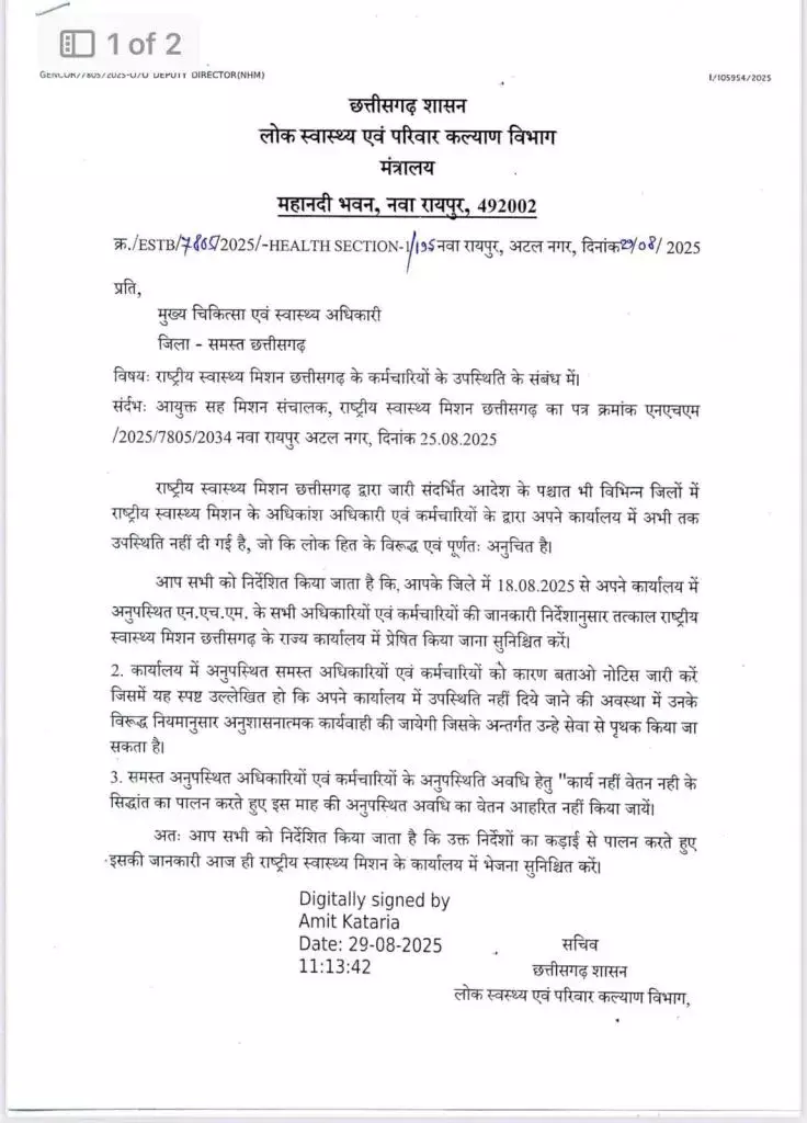 रायपुर। 10 सूत्रीय मांगों को लेकर हड़ताल कर रहे NHM कर्मचारी अगर काम पर नहीं लौटे तो उनके खिलाफ सेवा समाप्ति की कार्रवाई की जाएगी. इसका आदेश लोक स्वास्थ्य एवं परिवार कल्याण विभाग ने सभी सीएमएचओ को जारी कर दिया है.